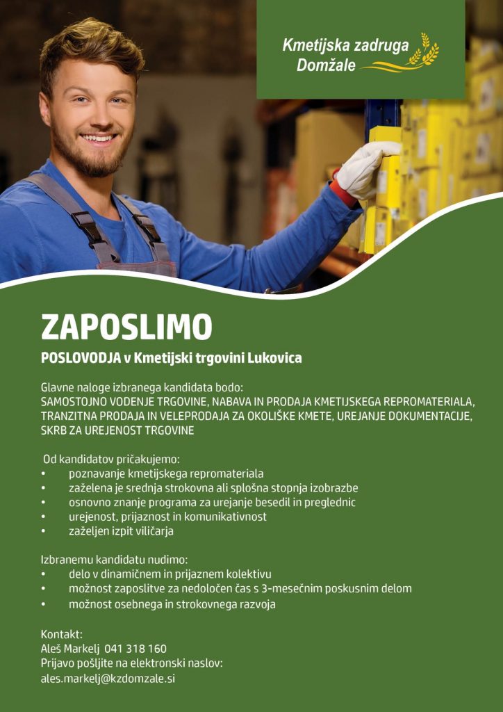 Zaposlimo poslovodja v Kmetijski trgovina Lukovica. Glavne naloge izbranega kandidata bodo: – samostojno vodenje trgovine, – nabava in prodaja kmetijskega repromateriala, – tranzitna prodaja in veleprodaja za okoliške kmete, – urejanje dokumentacije, – skrb za urejenost trgovine.